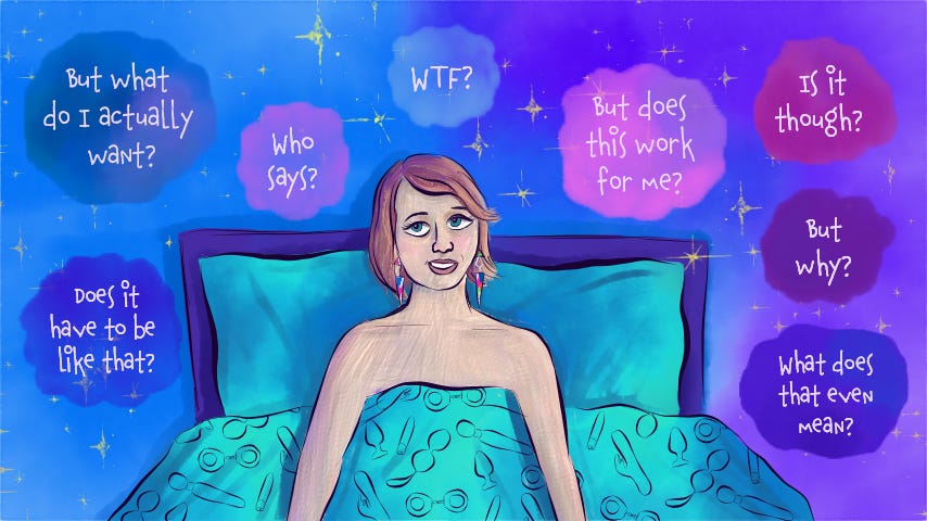 There’s a lot—a LOT—I could say about this and perhaps I will in another newsletter but for now let’s just leave it as follows: I am obviously still interested in sex and relationships but they are not the only things I am interested in, and I want and need to give myself space to explore other subjects. So rather than end the newsletter, I am working on redefining the relationship. Or, to put it in content creator language, I’m rebranding. However, I am not yet sure what I am rebranding to. That’s something I’m still thinking about/workshopping in my notes app. As always, I welcome your suggestions! The new version of the newsletter will inevitably have a very similar style and tone to this one (curiosity and compassion cut through with scepticism) and it will continue to offer explorations of feelings and experiences, analysis of human behaviour, and deep dives into culture and society but while some of them will almost certainly have to do with sex and relationships, they won’t all be about that. I also can’t guarantee I will write every week. I will aim to, of course, but it’s become really clear to me that I need some flexibility around that. So for now I’m not going to promise anything at all. I’m giving myself permission to fuck around and find out.